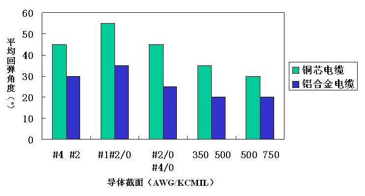 合金電纜的反彈性能比銅電纜少40%,在室溫條件下將銅電纜與合金電纜彎曲90度,應力釋放后,電纜的平均反彈角度如圖所示: